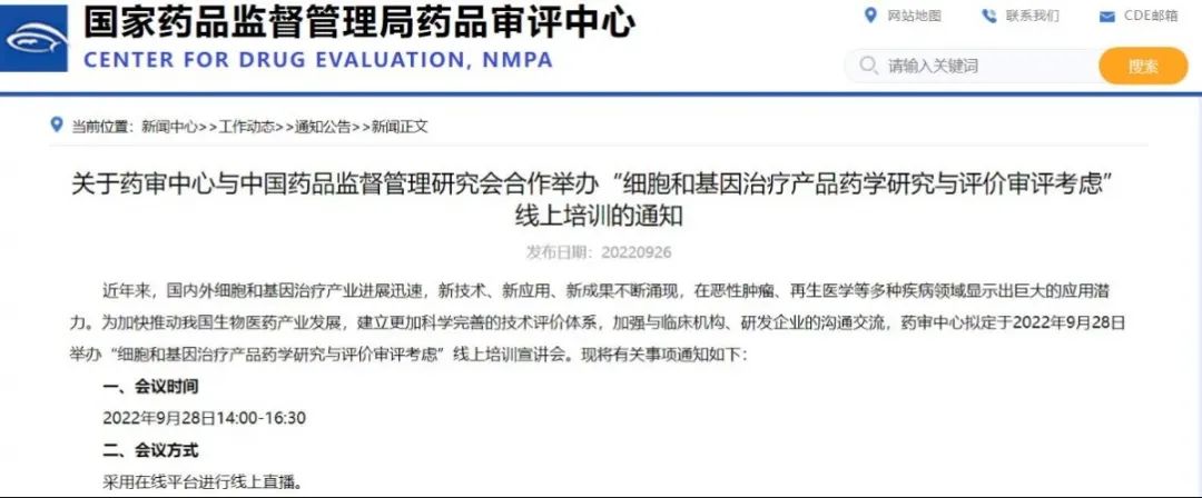 關于藥審中心與中國藥品監督管理研究會合作舉辦“細胞和基因治療產品藥學研究與評價審評考慮”線上培訓的通知