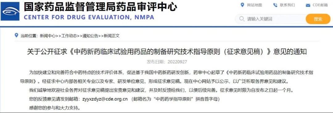 關于公開征求《中藥新藥臨床試驗用藥品的制備研究技術指導原則(征求意見稿)》意見的通知