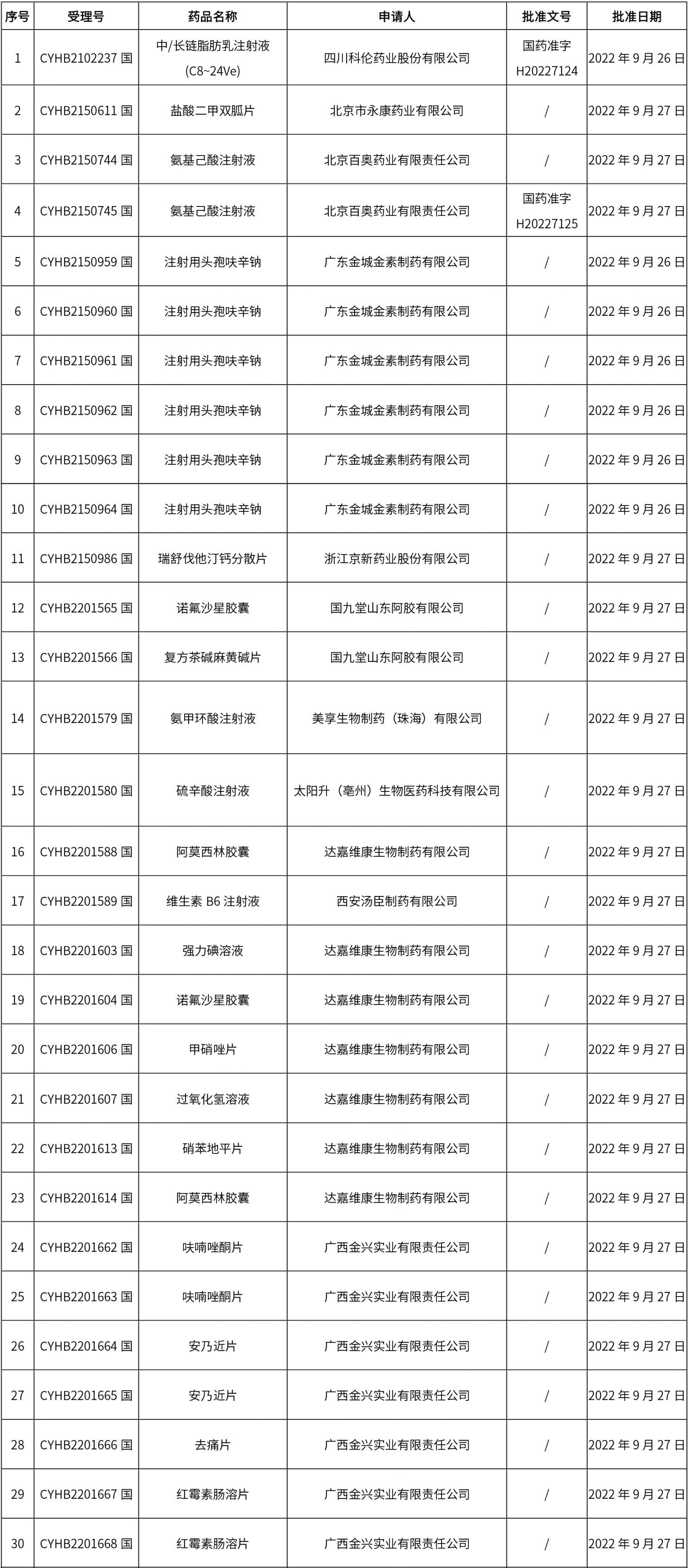 1. 本周(截止09.30中午12:15)共發布了211個品規的藥品批準證明文件待領取信息,其中一致性評價27個,注射劑51個(其中1個為滅菌注射用水)。