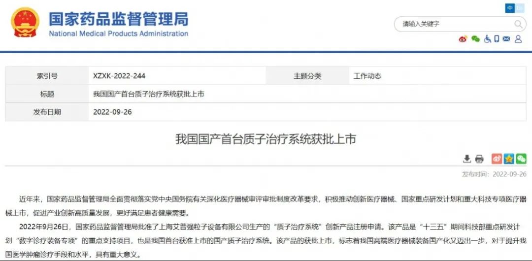 我國國產首臺質子治療系統獲批上市