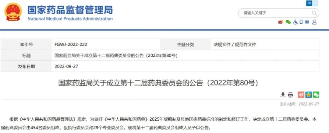 國家藥監局關于成立第十二屆藥典委員會的公告(2022年第80號)