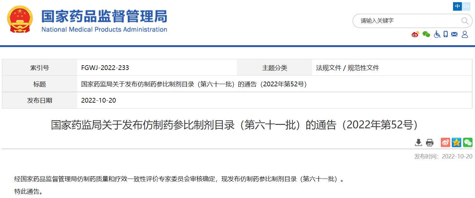 國家藥監局關于發布仿制藥參比制劑目錄(第六十一批)的通告(2022年第52號)