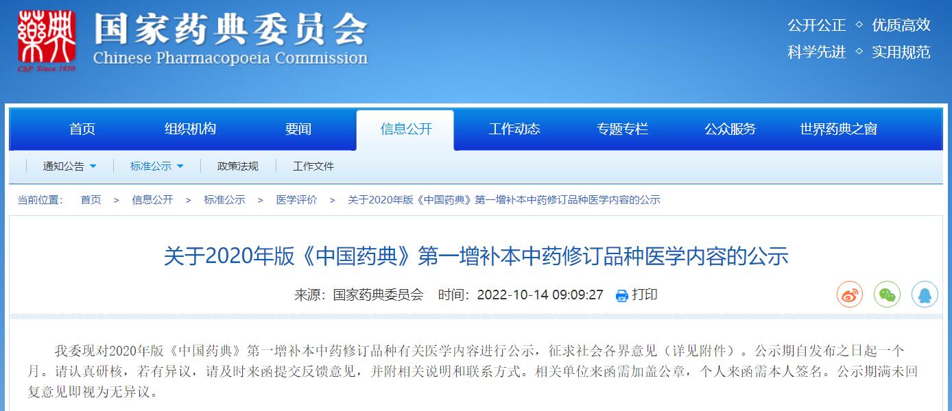關于2020年版《中國藥典》第一增補本中藥修訂品種醫學內容的公示