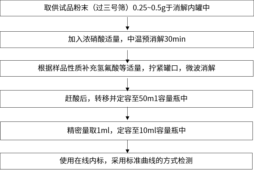案例二:新領先醫藥分析測試中心使用電感耦合等離子體質譜儀(ICP-MS)進行了中藥材中的鉛、鎘、砷、汞、銅等元素的的檢測。ICP-MS元素檢測的前處理方法流程如下: