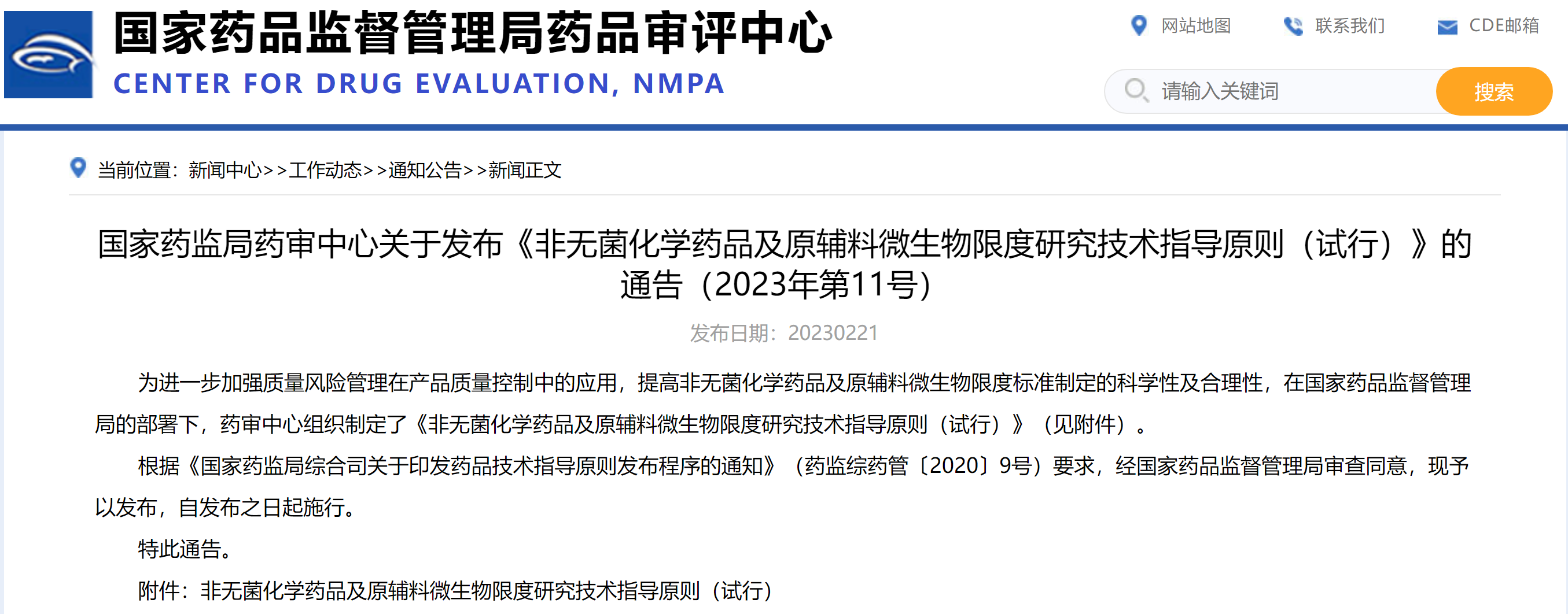國家藥監局藥審中心關于發布《非無菌化學藥品及原輔料微生物限度研究技術指導原則(試行)》的通告(2023年第11號)