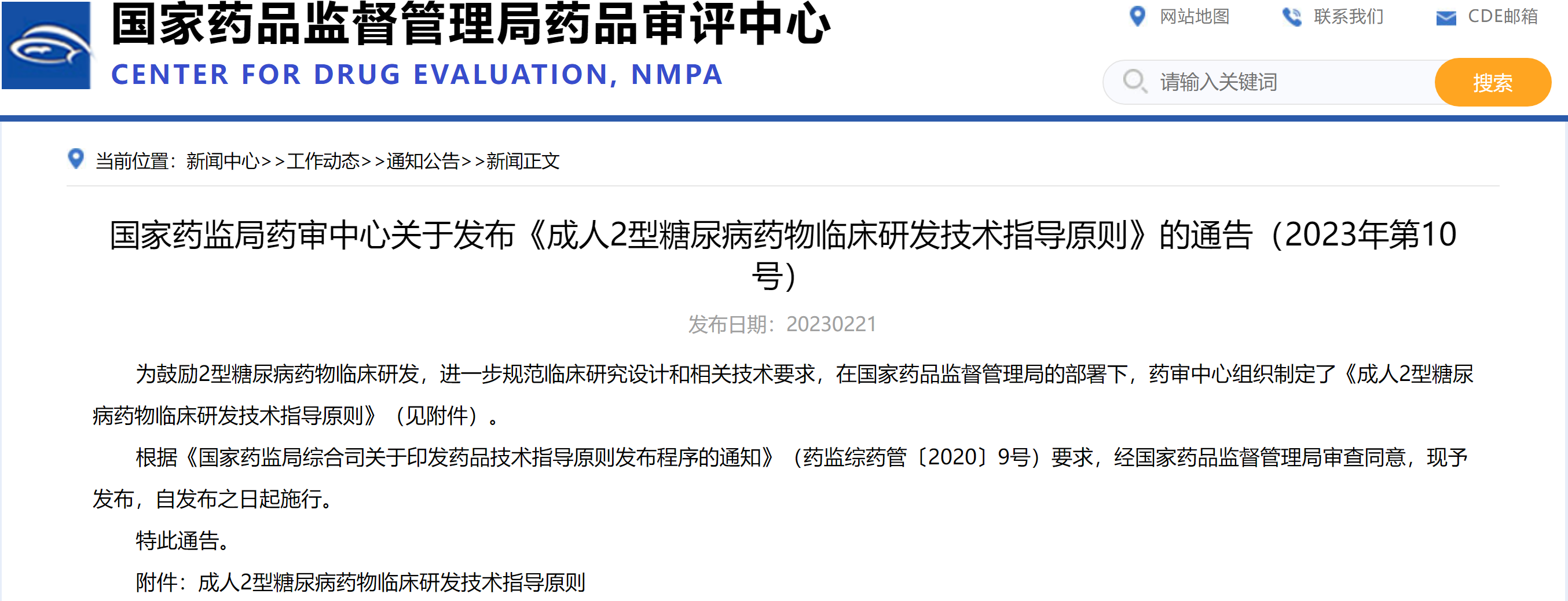 國家藥監局藥審中心關于發布《成人2型糖尿病藥物臨床研發技術指導原則》的通告(2023年第10號)
