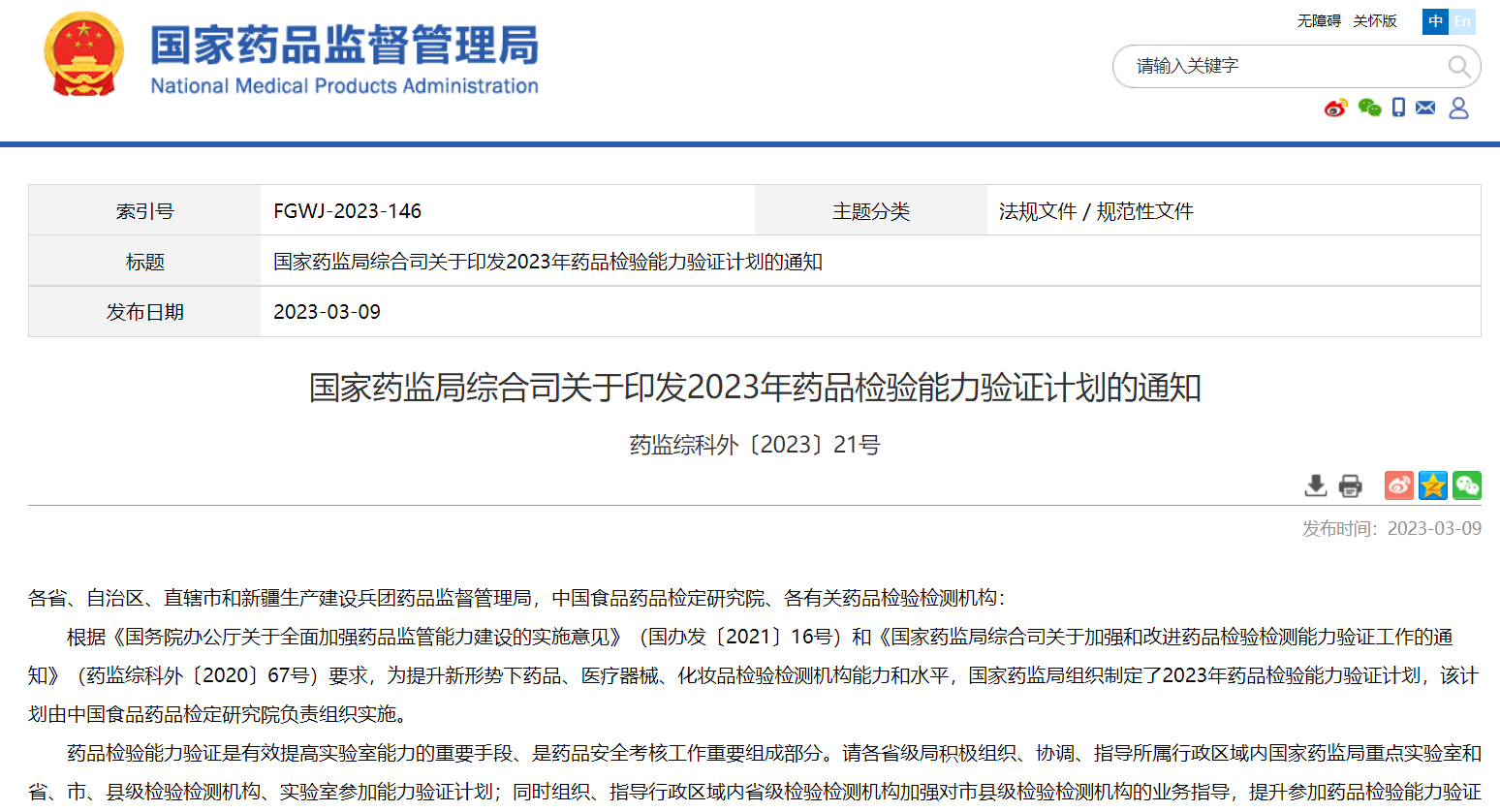 國家藥監局綜合司關于印發2023年藥品檢驗能力驗證計劃的通知