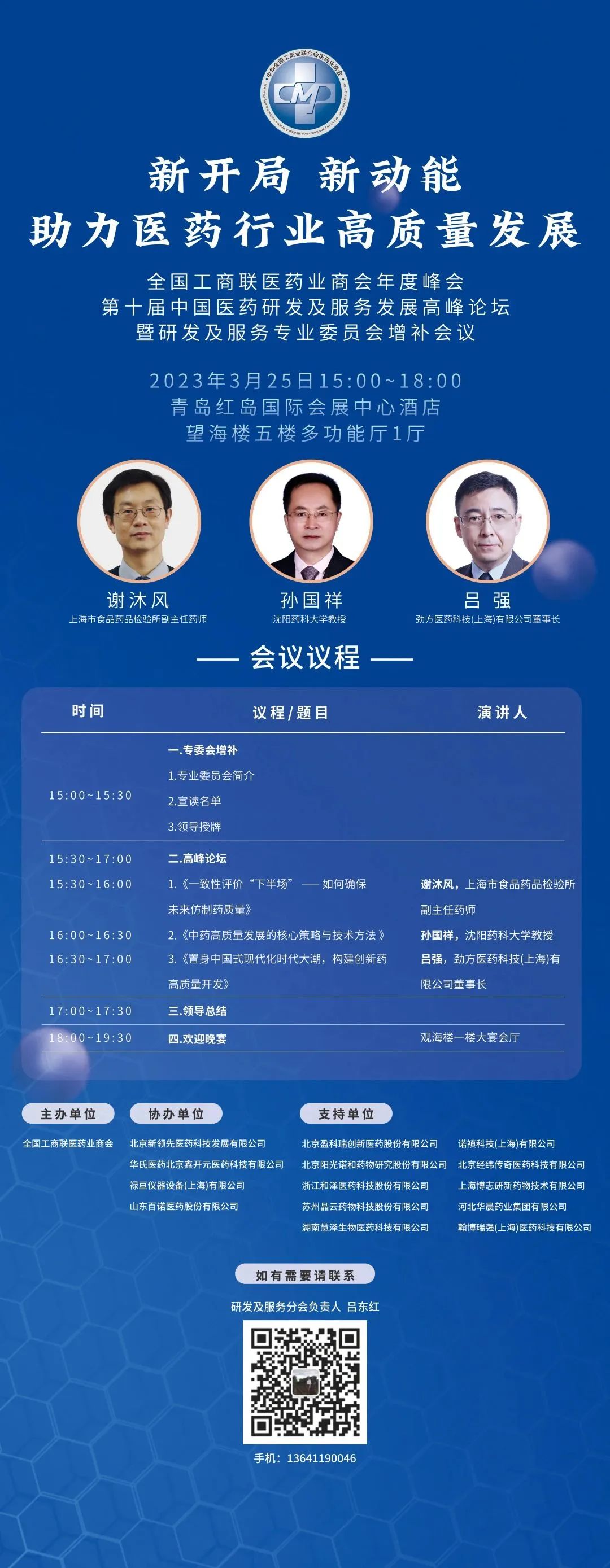 由全國工商聯醫藥業商會主辦,北京新領先醫藥聯合承辦的全國工商聯醫藥業商會年度峰會暨第十屆中國醫藥研發及服務發展高峰論壇將于3月25-27日在青島召開。