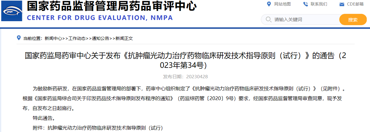 國家藥監局藥審中心關于發布《抗腫瘤光動力治療藥物臨床研發技術指導原則(試行)》的通告(2023年第34號)