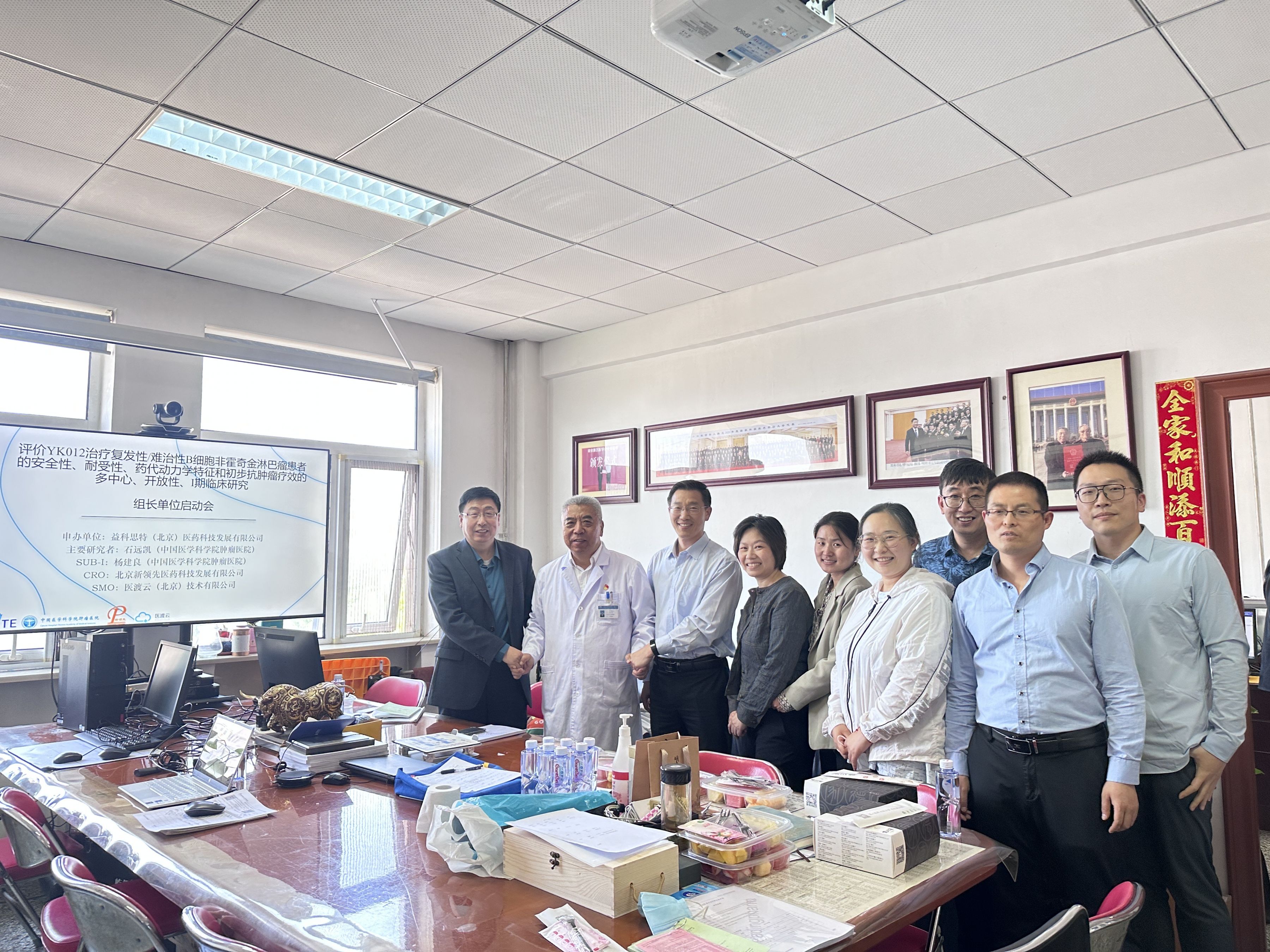 ▲ 中國醫學科學院腫瘤醫院臨床研究中心副院長、腫瘤內科主任石遠凱教授(左2),益科思特(北京)醫藥科技發展有限公司聯合創始人孟慶武先生(左1)和聯合創始人袁清安博士(左3),北京新領先醫藥臨床事業部運營總監潘麗怡女士(左4),申辦方臨床副總監任沖(右3)及CRO方醫學總監袁少雄女士(右4))團隊代表等啟動會現場合影