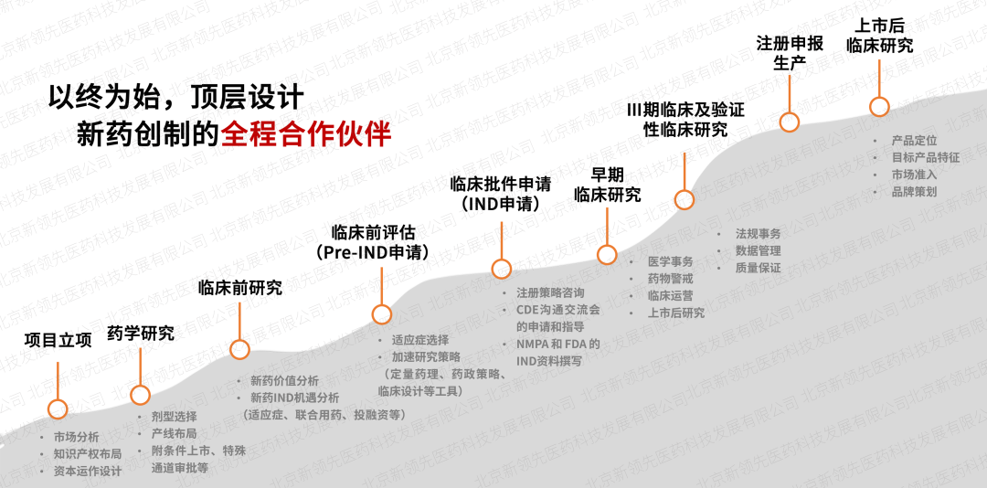 依托于新領先CXO服務體系,創建了“交互式”臨床服務模式,在項目立項階段全面介入,做新藥創制的全程合作伙伴,整合醫學、藥政、藥學研發等技術專家進行頂層設計,最大限度降低項目研發風險。同時,成立專項政府引導基金,為創新項目提供不同階段的投融資,最大程度加速藥品上市進程。此外,強大的定量藥理學及體內外橋接團隊針對特定疾病和特定人群進行數字模型研究,制定科學高質的臨床研究方案,提高新藥臨床開發效率。