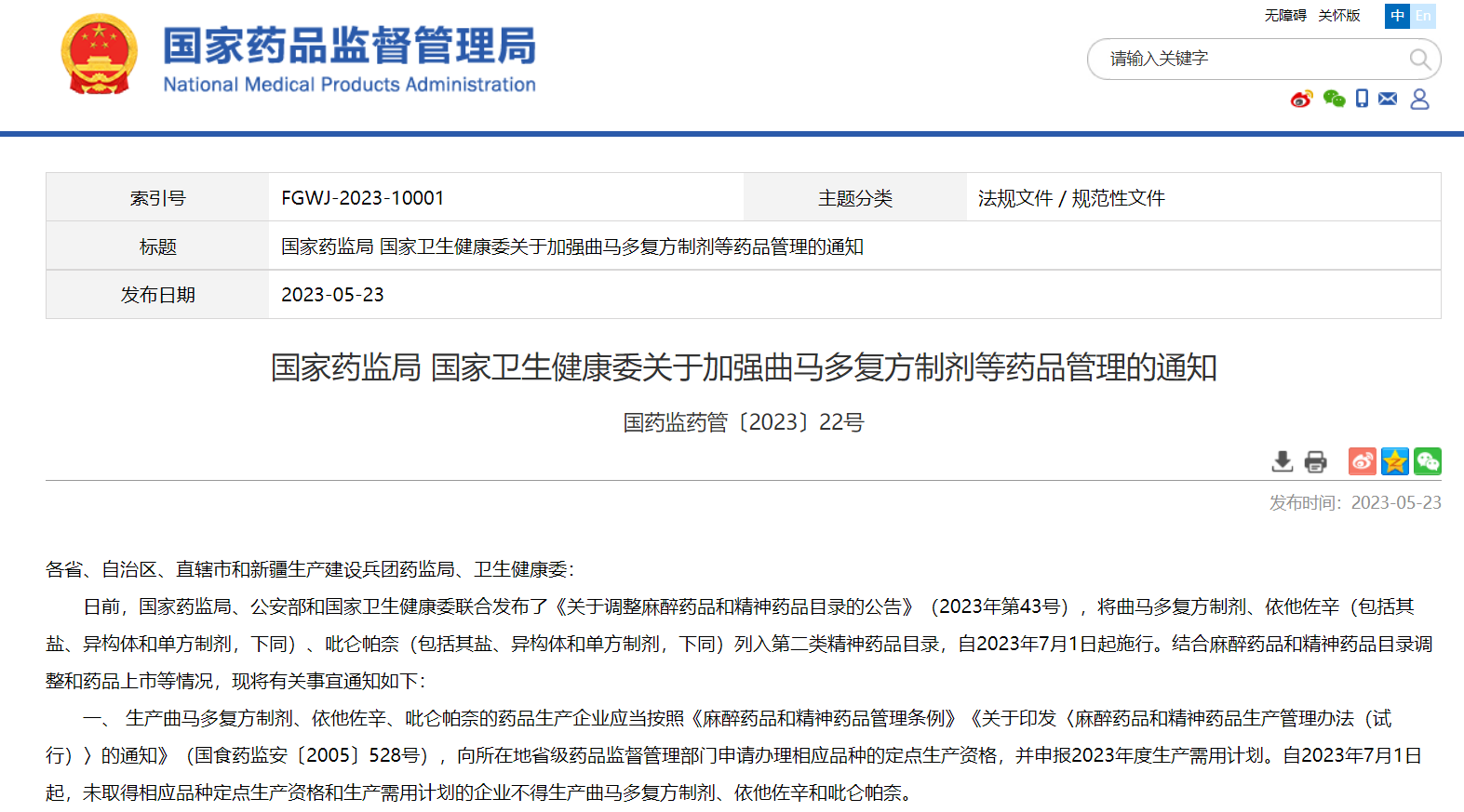 國家藥監局 國家衛生健康委關于加強曲馬多復方制劑等藥品管理的通知