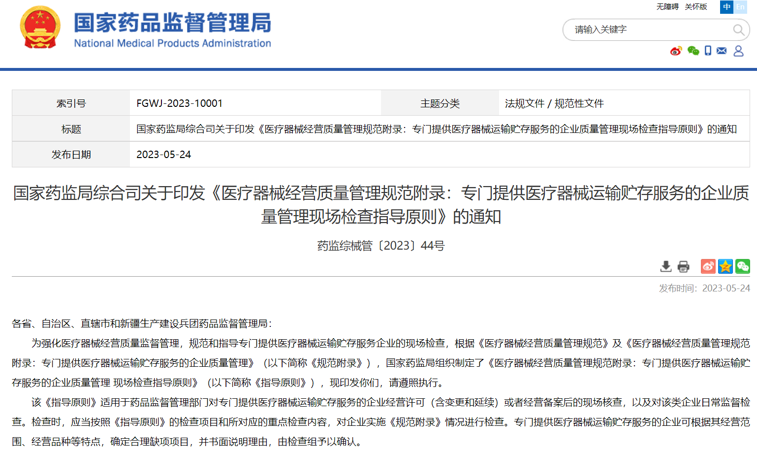 國家藥監局綜合司關于印發《醫療器械經營質量管理規范附錄:專門提供醫療器械運輸貯存服務的企業質量管理現場檢查指導原則》的通知