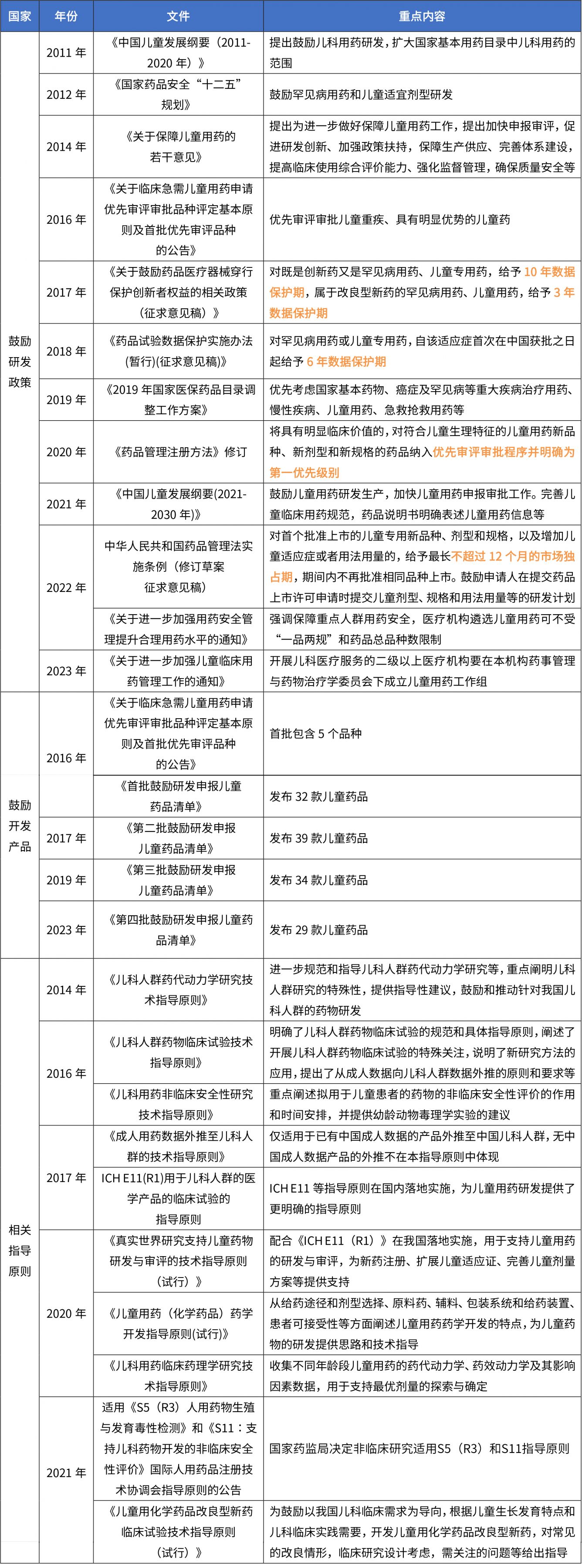 在我國,為鼓勵國內藥企加大兒童藥的研發和生產,近年來,政府部門陸續出臺了一系列相關政策,包括鼓勵研發、優先評審、加強醫院配備、招標采購直接掛網等,部分法規詳見下表。