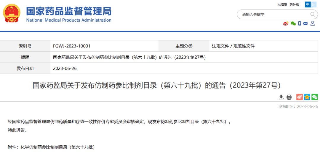 國家藥監局關于發布仿制藥參比制劑目錄(第六十九批)的通告(2023年第27號)