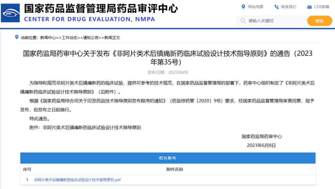國家藥監局藥審中心關于發布《非阿片類術后鎮痛新藥臨床試驗設計技術指導原則》的通告(2023年第35號)