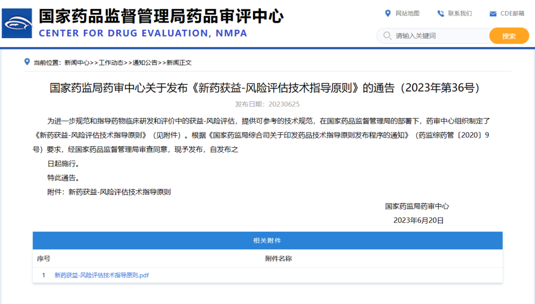 國家藥監局藥審中心關于發布《新藥獲益-風險評估技術指導原則》的通告(2023年第36號)