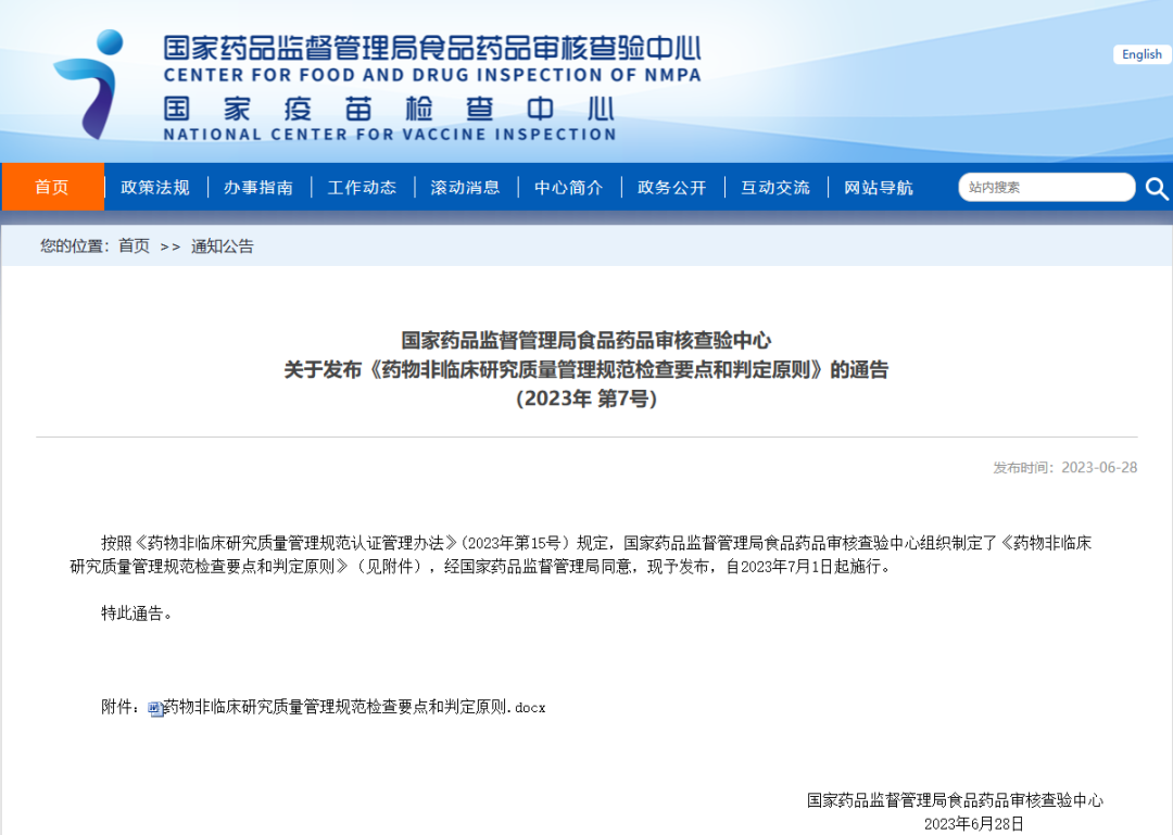 國家藥品監督管理局食品藥品審核查驗中心關于發布《藥物非臨床研究質量管理規范檢查要點和判定原則》的通告(2023年 第7號)