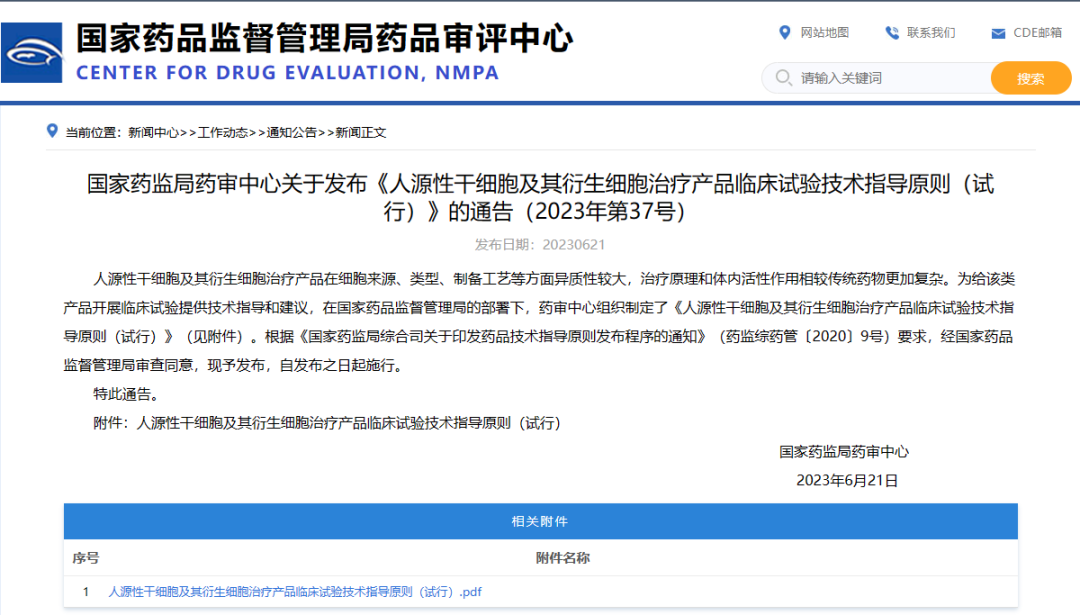 國家藥監局藥審中心關于發布《人源性干細胞及其衍生細胞治療產品臨床試驗技術指導原則(試行)》的通告(2023年第37號)