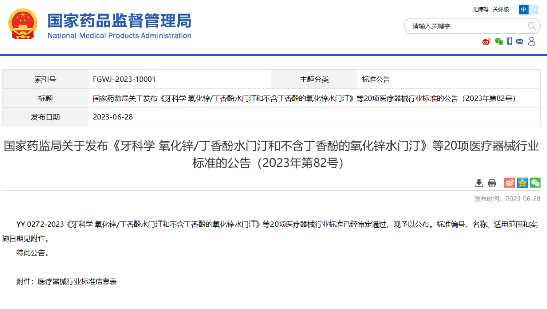 國家藥監局關于發布《牙科學 氧化鋅/丁香酚水門汀和不含丁香酚的氧化鋅水門汀》等20項醫療器械行業標準的公告(2023年第82號)