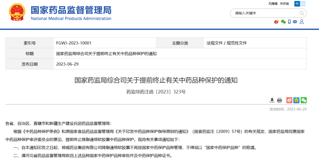 國家藥監局綜合司關于提前終止有關中藥品種保護的通知