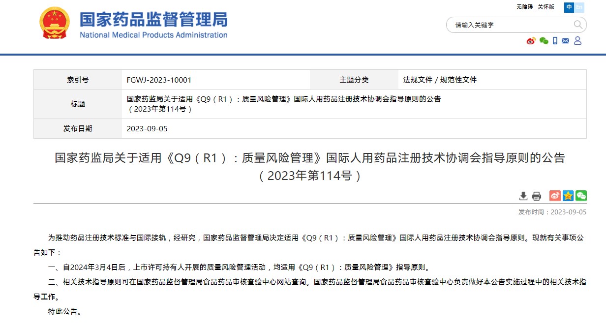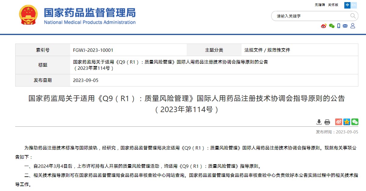 國家藥監局關于適用《Q9(R1):質量風險管理》國際人用藥品注冊技術協調會指導原則的公告(2023年第114號)