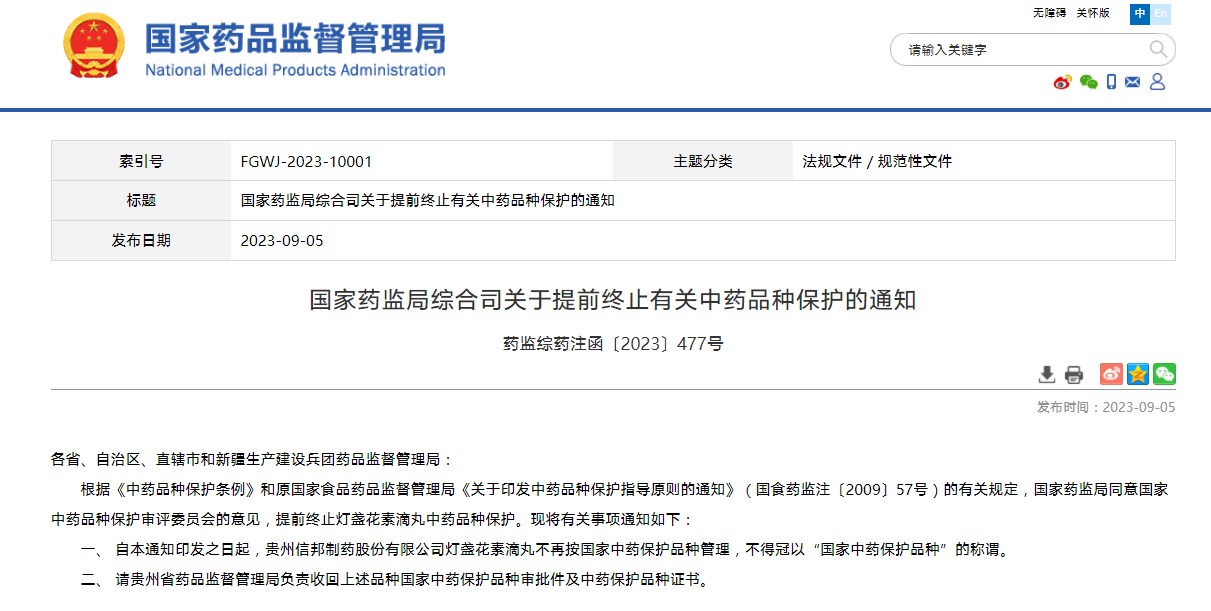 國家藥監局綜合司關于提前終止有關中藥品種保護的通知