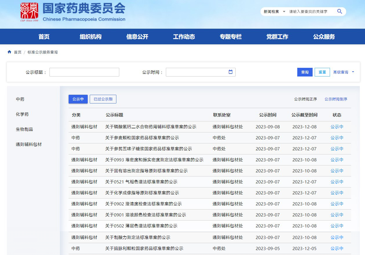 近期藥典委發布關于腦脈利顆粒、參芪五味子糖漿、參麥顆粒 國家藥品標準草案,關于磷酸氫鈣二水合物國家藥用輔料標準草案,關于制酸力測定法、0502 薄層色譜法、0901 溶液顏色檢查法、0902 澄清度檢查法、0521 氣相色譜法、0993 堆密度和振實密度測定法標準草案,關于化學成像、固有溶出測定指導原則標準草案的公示。