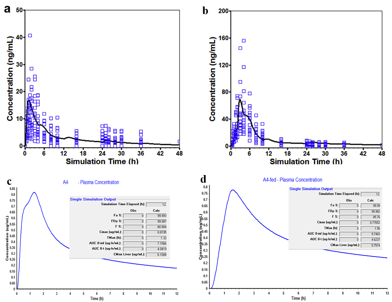 說明:a和b是參考文獻中案例4的軟件模擬和預測值,c和d是小編建模模擬值,小編在模擬過程中發現針對BCSII類弱堿性化合物,溶出模型選擇Johnson模型時,pH對應溶解度對模擬結果影響很大,小編輸入pH1對應溶解度與結果擬合較好,為了與文獻值相似,小編也同文獻將腸液體積從GastroPlus™的默認值進行調整,Cmax模擬結果與文獻相似。
