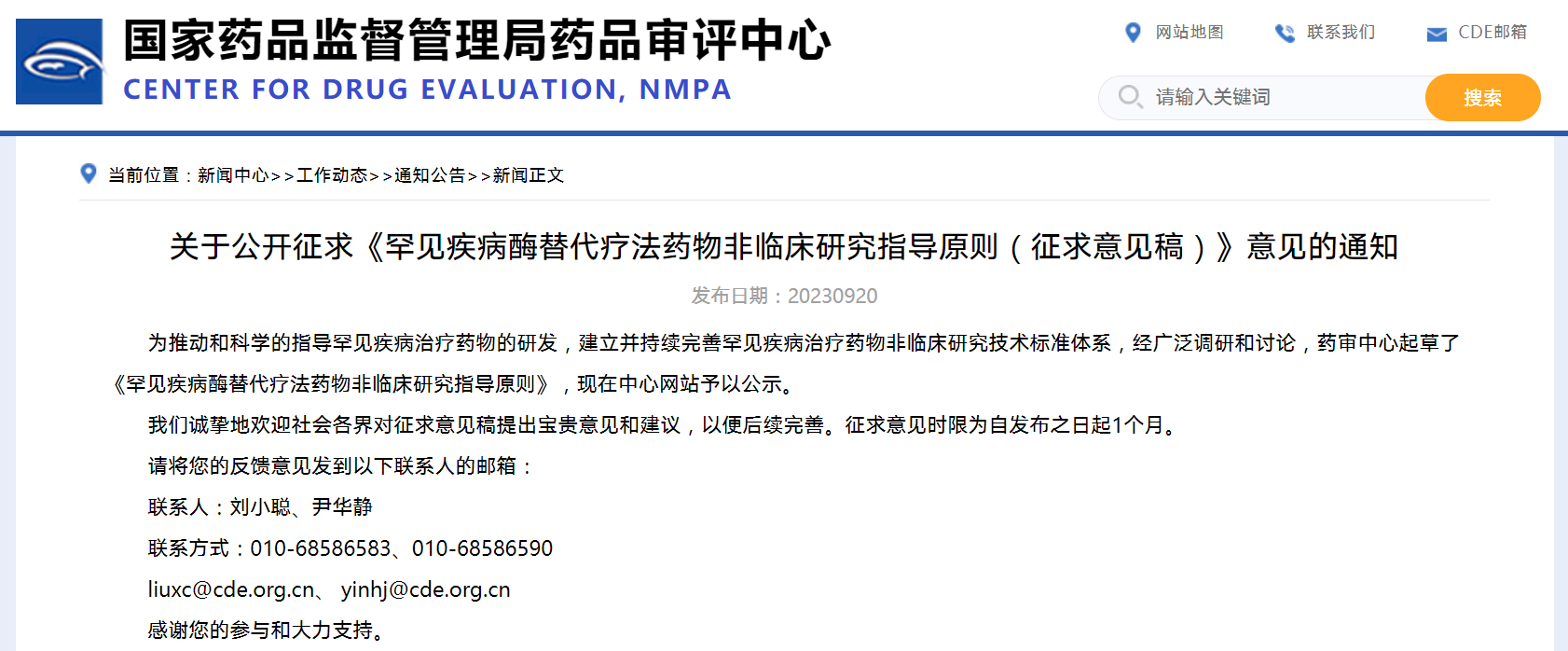 關于公開征求《罕見疾病酶替代療法藥物非臨床研究指導原則》(征求意見稿)意見的通知