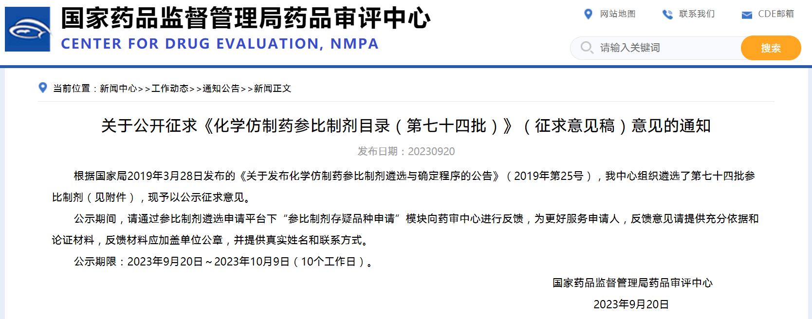 關于公開征求《化學仿制藥參比制劑目錄(第七十四批)》(征求意見稿)意見的通知