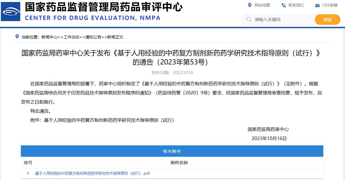 國家藥監(jiān)局藥審中心關(guān)于發(fā)布《基于人用經(jīng)驗(yàn)的中藥復(fù)方制劑新藥藥學(xué)研究技術(shù)指導(dǎo)原則(試行)》的通告(2023年第53號)