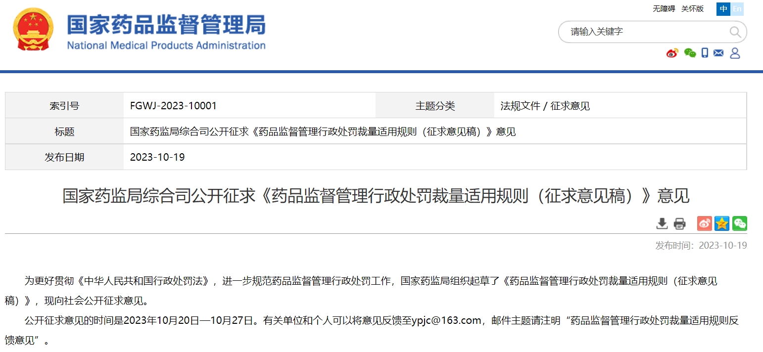 國家藥監(jiān)局綜合司公開征求《藥品監(jiān)督管理行政處罰裁量適用規(guī)則(征求意見稿)》意見