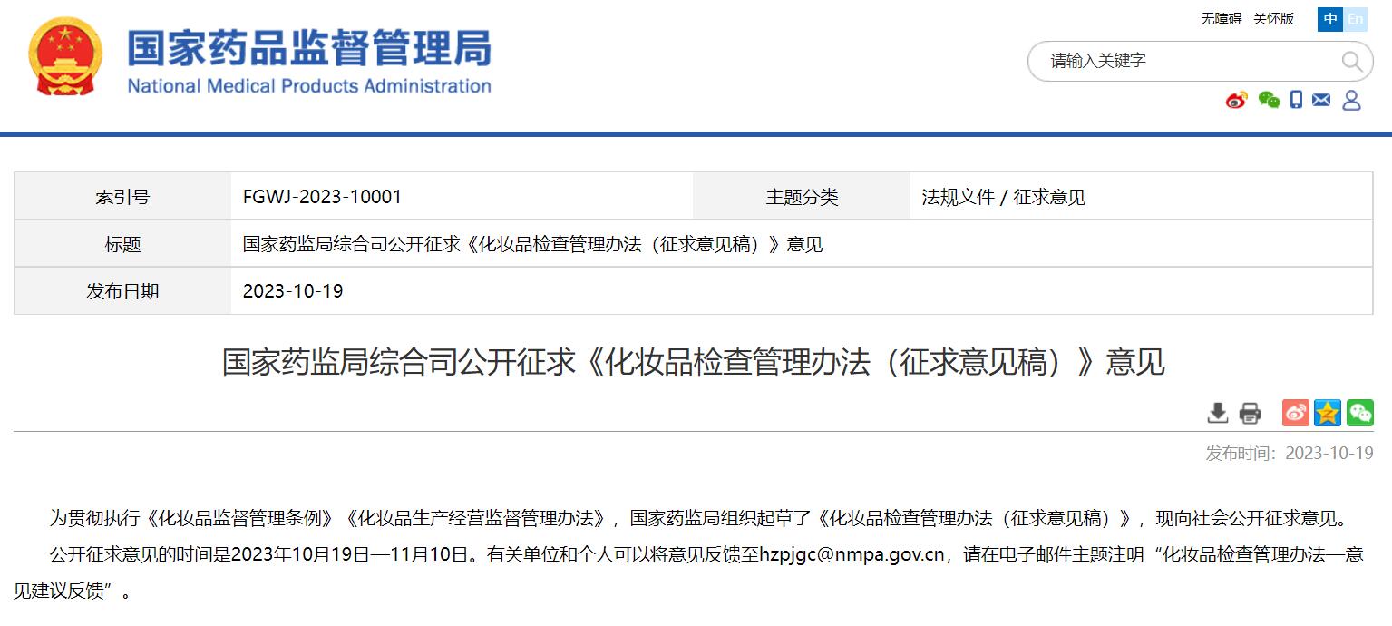 國家藥監(jiān)局綜合司公開征求《化妝品檢查管理辦法(征求意見稿)》意見