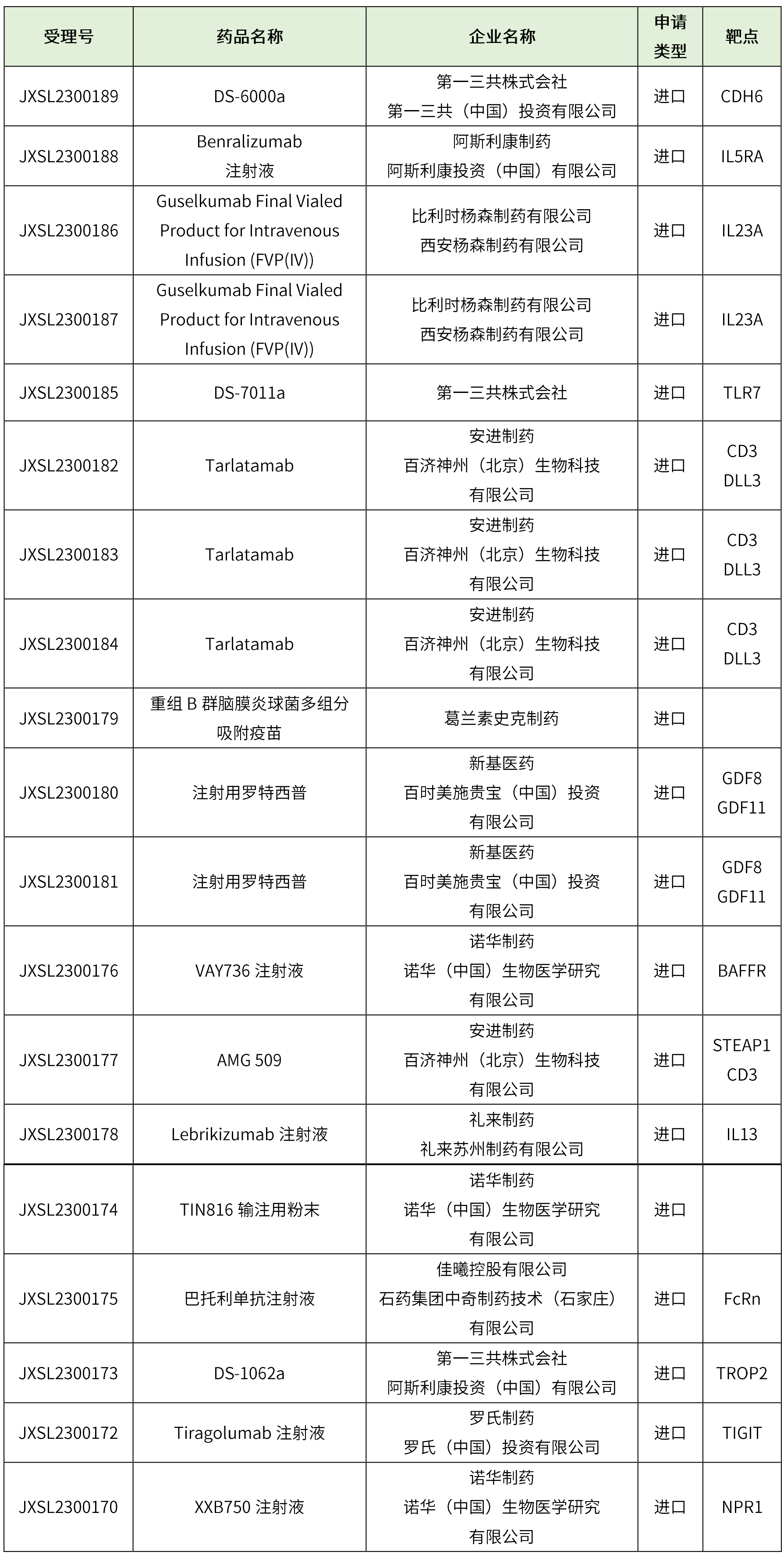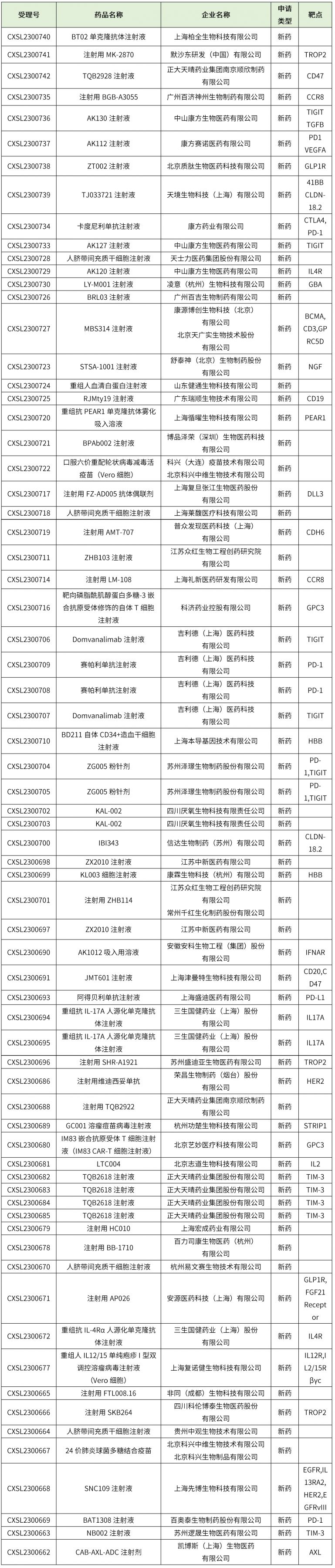 共計74個,其中進口臨床申請15個,國產臨床申請58個,其他1個,藥物詳細信息見下表。