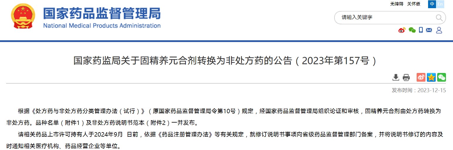 國家藥監局關于固精養元合劑轉換為非處方藥的公告(2023年第157號)