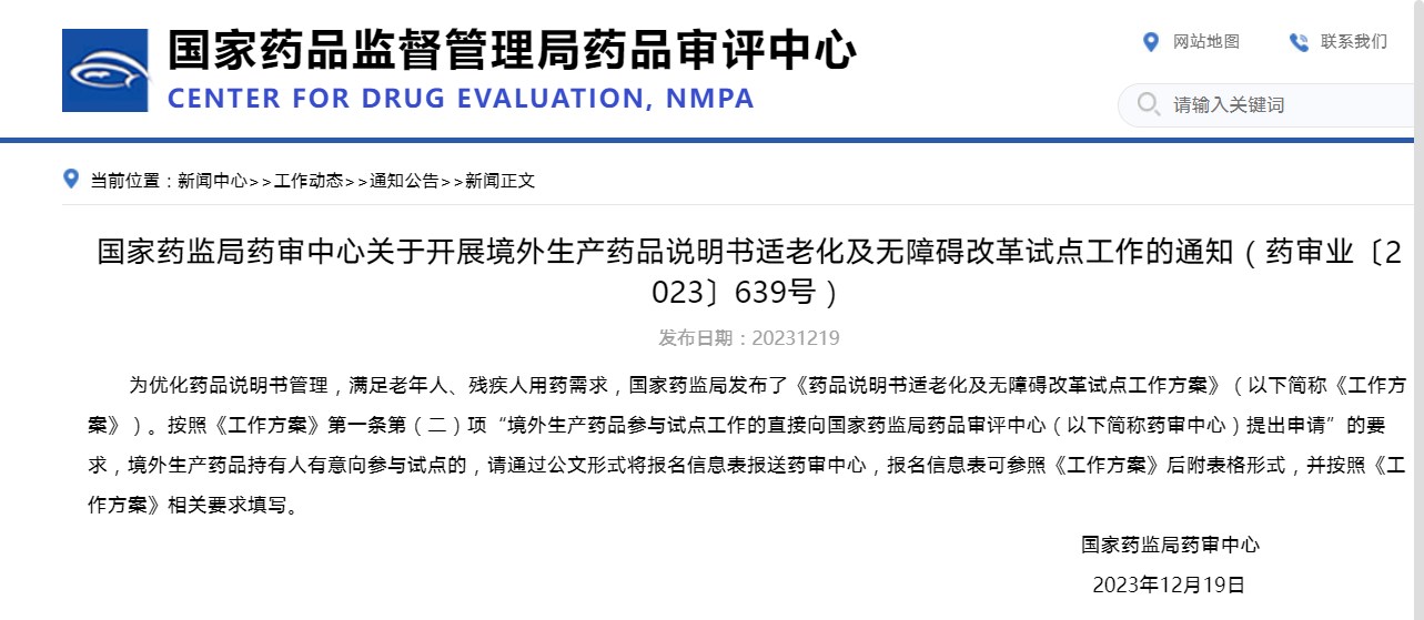 國家藥監(jiān)局藥審中心關(guān)于開展境外生產(chǎn)藥品說明書適老化及無障礙改革試點(diǎn)工作的通知(藥審業(yè)〔2023〕639號(hào))