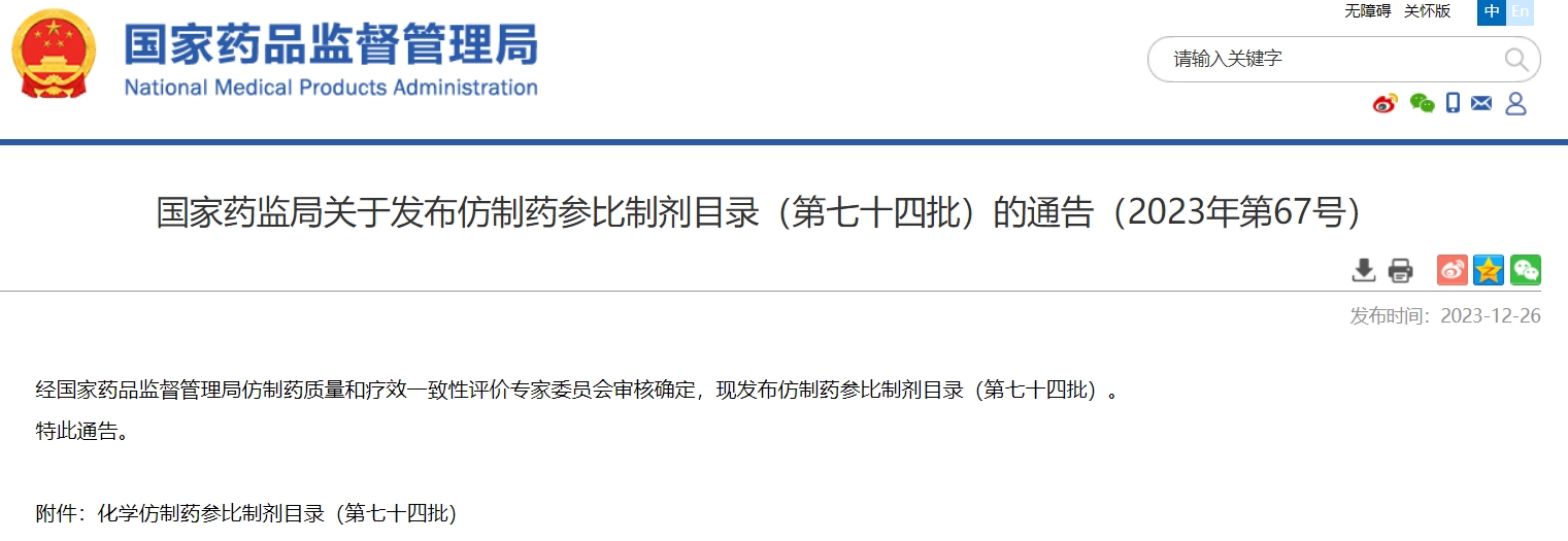 政策法規 || 仿制藥參比制劑目錄(第七十四批)發布(附法規概覽12.25-12.29)