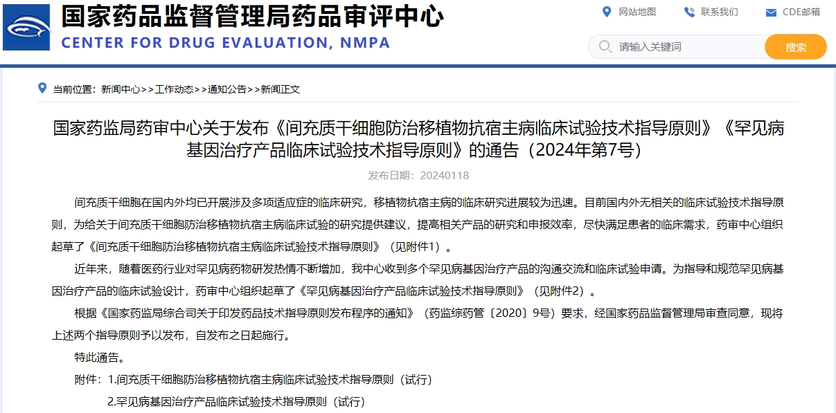 國家藥監局藥審中心關于發布《間充質干細胞防治移植物抗宿主病臨床試驗技術指導原則》《罕見病基因治療產品臨床試驗技術指導原則》的通告(2024年第7號)