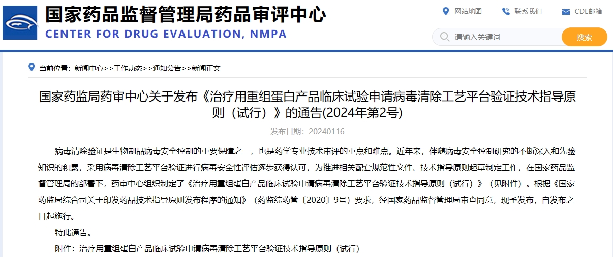 國家藥監局藥審中心關于發布《治療用重組蛋白產品臨床試驗申請病毒清除工藝平臺驗證技術指導原則(試行)》的通告(2024年第2號)