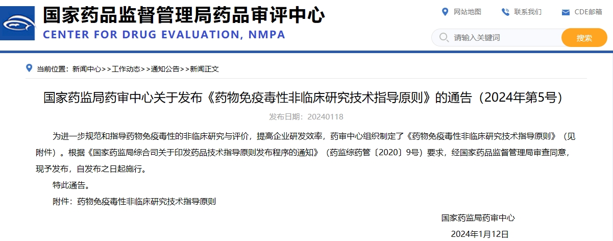 國家藥監局藥審中心關于發布《藥物免疫毒性非臨床研究技術指導原則》的通告(2024年第5號)