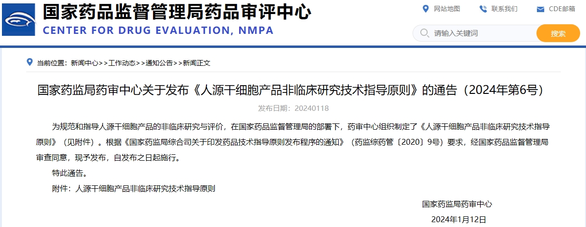 國家藥監局藥審中心關于發布《人源干細胞產品非臨床研究技術指導原則》的通告(2024年第6號)指導原則》的通告(2024年第5號)