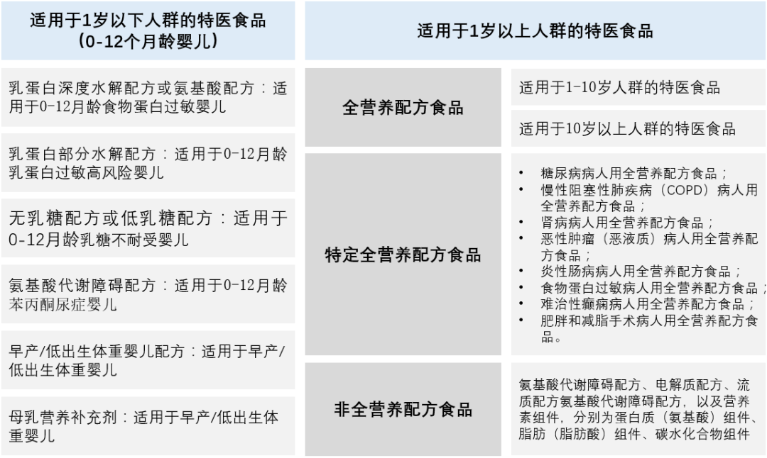 特殊醫學用途配方食品分為供1歲以下嬰兒食用的特殊醫學用途嬰兒配方食品和供1歲以上人群食用的特殊醫學用途配方食品。適用于1歲以上人群的特醫食品又分為全營養配方食品、特定全營養配方食品和非全營養配方食品。