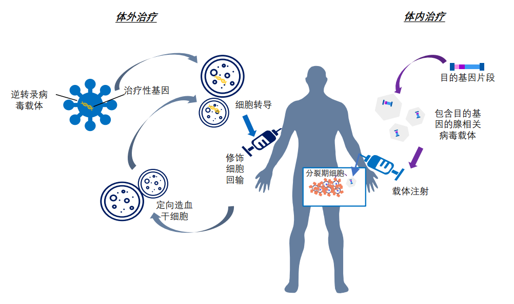 根據治療途徑,基因治療可分為體內基因治療和體外基因治療。其中體內基因治療是指將攜帶治療性基因的病毒或非病毒載體直接遞送到患者體內;體外基因治療則指將患者的細胞在體外進行遺傳修飾后回輸。