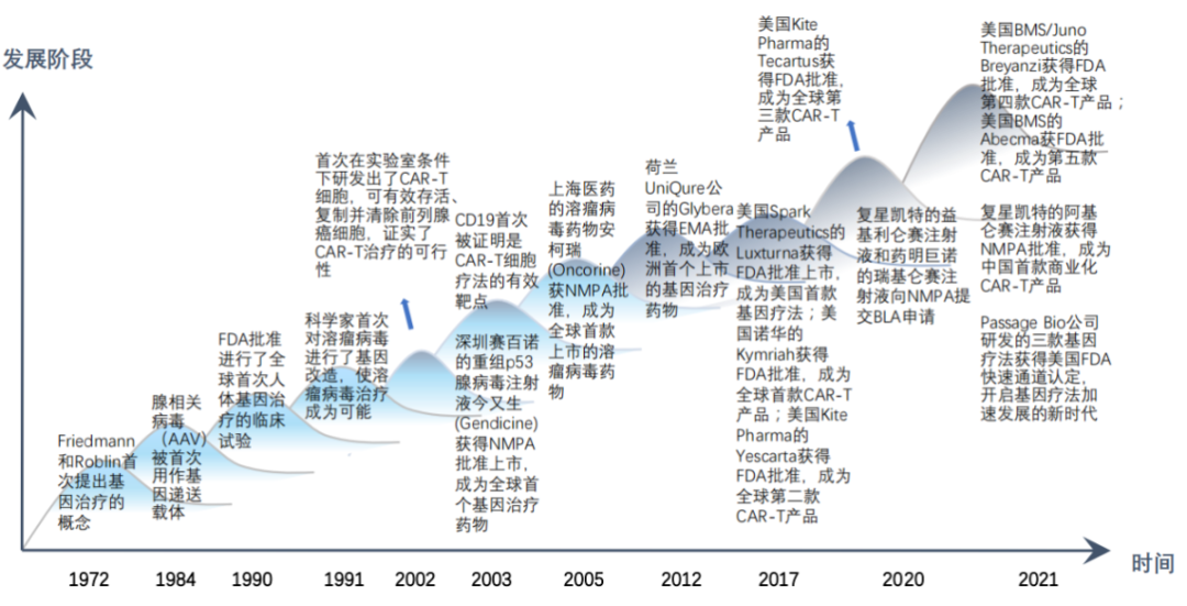 過去30多年來, CGT領域抵住一個又一個時間節點的考驗逐步蛻變。從1990年代首項相關臨床試驗啟動,到2000年代因出現嚴重不良反應,整個領域遇冷,之后在人才、資本和政策的多重利好下,CGT重煥新生。數十款包括CAR-T療法、干細胞療法、溶瘤病毒療法和基因療法等在內的創新產品涌現,帶動了產業鏈上下游發展。