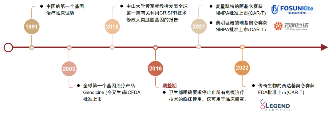 我國細胞與基因治療在20世紀90年代已有臨床研究,至2005年有兩款針對實體瘤的CGT產品,但是之后幾年熱度消散,直到2010年后細胞治療開始受到各大藥企及研發機構的青睞。2016年,魏則西事件一度導致一些細胞免疫管線研發進展滯后,然而隨著相關技術指導與監管體系的完善,CGT發展迅速,大量CGT產品進入臨床試驗,生物技術公司爭相布局CGT產業,復星凱特的阿基侖賽注射液于2021年6月獲得NMPA批準,成為中國首款上市的CAR-T產品。2022年傳奇生物的CAR-T產品西達基奧侖賽獲FDA批準上市。