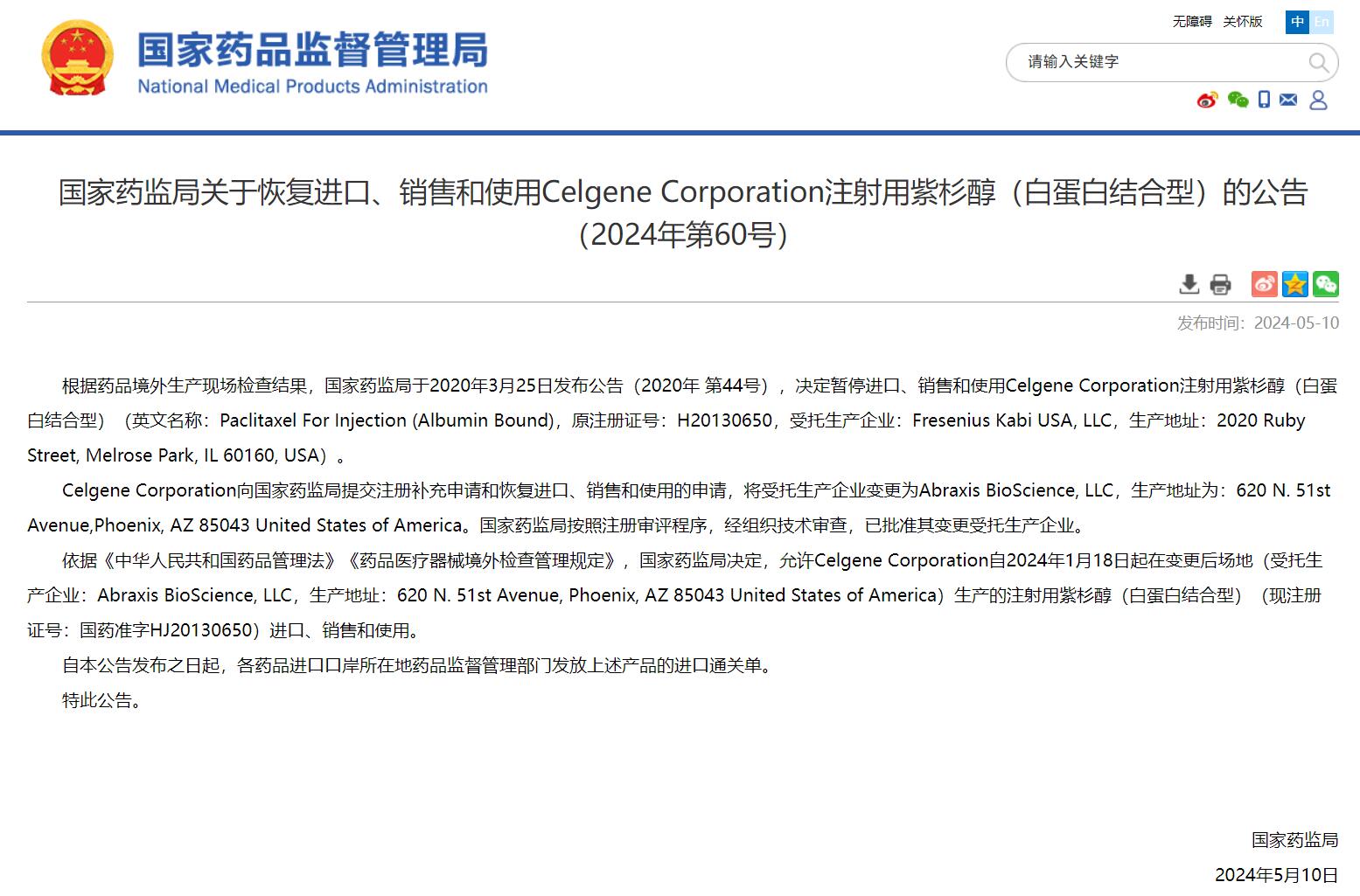 國家藥監局關于恢復進口、銷售和使用Celgene Corporation注射用紫杉醇(白蛋白結合型)的公告(2024年第60號)