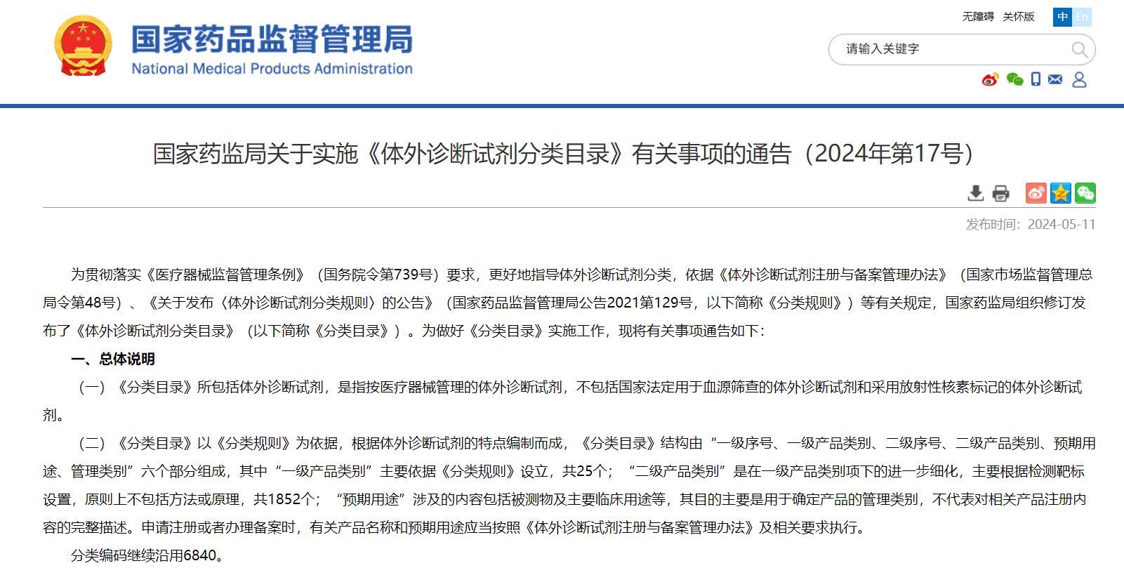 國家藥監局關于實施《體外診斷試劑分類目錄》有關事項的通告(2024年第17號)