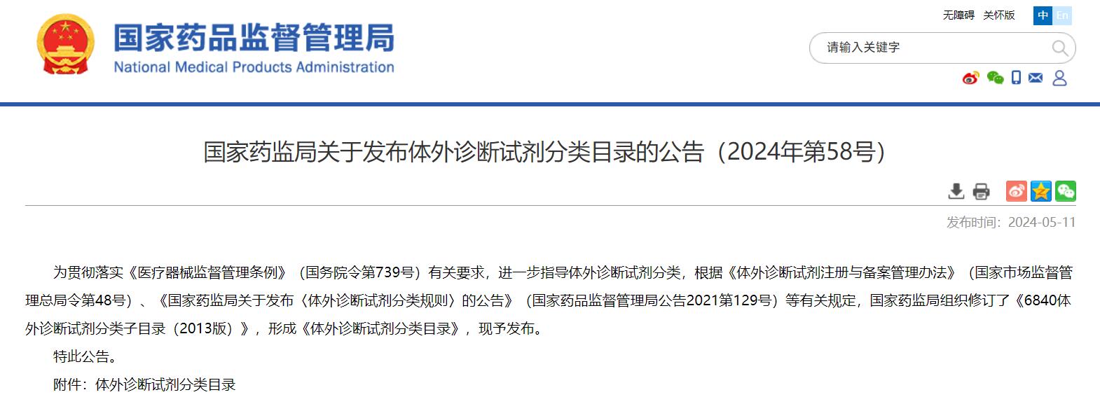 國家藥監局關于發布體外診斷試劑分類目錄的公告(2024年第58號)