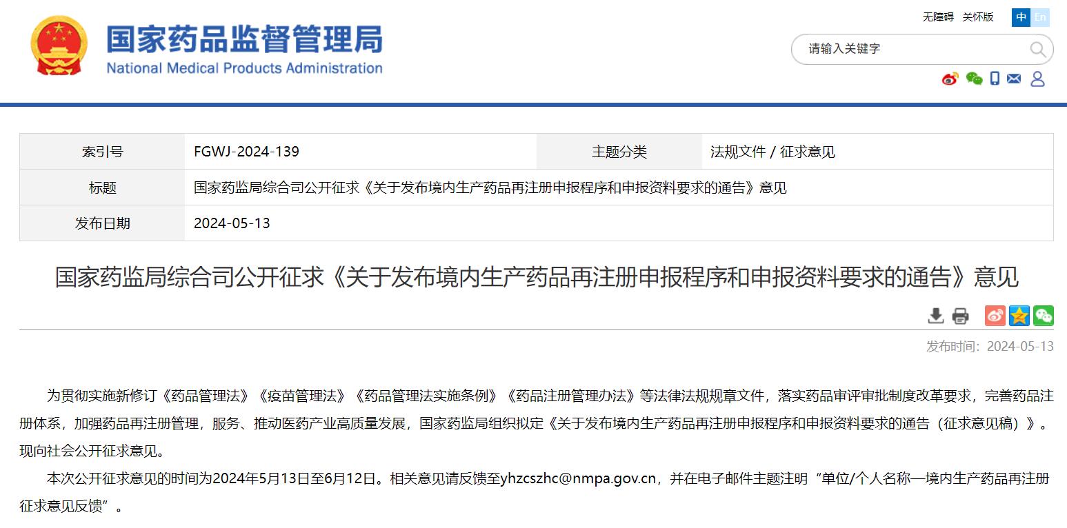 國家藥監局綜合司公開征求《關于發布境內生產藥品再注冊申報程序和申報資料要求的通告》意見